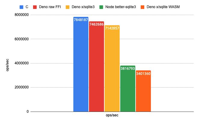 Benchmark using SQLite’s C API via Deno FFI. Higher is better.